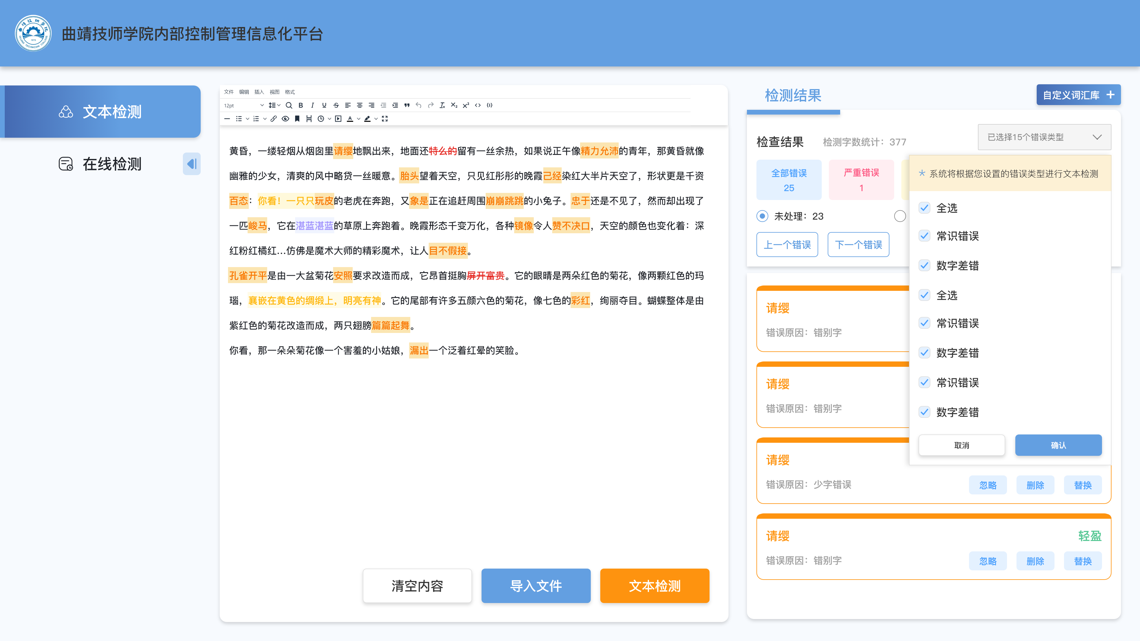 随着信息技术发展和学校信息化建设深入,曲靖技师学院为提升财务与项目管理科学化精细化水平,响应国家及云南省要求,抓住财政改革与信息化契机,以健全制度、技术改善、绩效导向为原则,“高起点、高标准、高水平”推进内控管理平台建设。平台基于现行制度,依托大数据、云计算及智慧校园数据平台,构建风险、内控、合规一体化体系。其核心为上报、监控、预警、处置,覆盖收支、预算、经费、项目、合同、资产、报销、绩效、档案等全环节,实现流程标准化、过程可追溯监管、部门高效协同、电子化归档及全周期预算风险管控,并支持移动化管理。平台将组织、政策、程序、制度融合于服务,保障经济活动合规、资金资产安全完整,有效防范和管控风险。▍内控管理平台功能建设